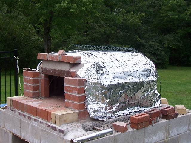 Now the firebricks that make up the food cavity are wrapped in heavy duty aluminum foil so the bricks and concrete cladding can "slip" when the oven heats up, hopefully preventing cracking of the outside facework when the oven is heated.