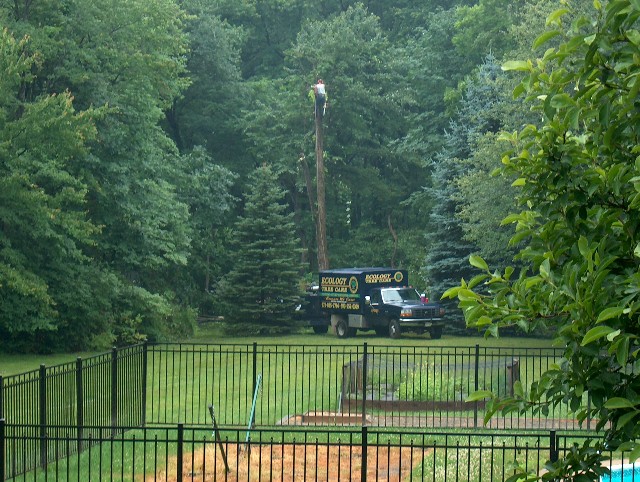 The first step is to locate where the oven will be placed. In this case, I am relocating an old stone fireplace that was much too close to the treeline and posed a fire hazard. Locating the grill by the pool seems like a good idea and I can get help from the tree trimming guys in pulling out two sections of the pool fence.