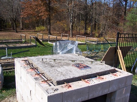 The base and floating hearth are now in place. The hearth was poured on top of forms supporting its bottom while it dried. After is cured, the supports and floor were removed from beneath. A one-inch gap needs to be maintained between the hearth and the block wall so that the foundation doesn't crack when the hearth heats up and expands.